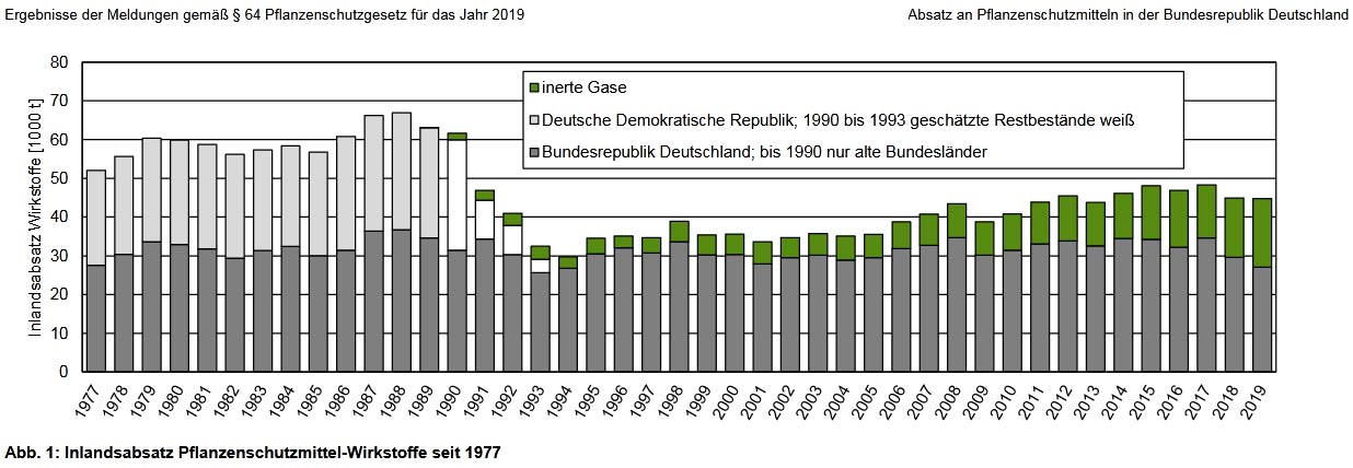 Seit der Deutschen Einheit ist der Einsatz von Insektiziden und Pestiziden deutlich zurückgegangen, blieb bis 2005 ungefähr auf dem gleichen Niveau von rund 35.000 Tonnen. Aber seitdem stiegen die verkauften Mengen wieder deutlich an von 35.494 Tonnen im Jahr 2005 auf 48.306 Tonnen im Jahr 2017, das nach Einschätzung des BVL deshalb so hohen Mitteleinsatz brauchte, weil es sehr feucht war und die „Unkräuter“ deshalb so stark wuchsen.