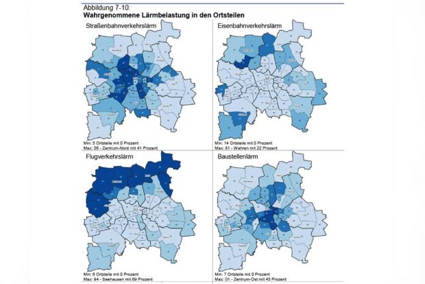 So stellen es auch die Autor/-innen des Berichts fest: „Prägnant ist das räumliche Muster zur Fluglärmbelastung: Zwar steht die Belastung durch diesen Lärm insgesamt nur an fünfter Stelle, kleinräumig treten jedoch große Unterschiede auf, denn in Flughafennähe wird die Lärmbelastung deutlich stärker eingeschätzt: In Burghausen-Rückmarsdorf, Böhlitz-Ehrenberg, Wiederitzsch und Lindenthal empfinden über ein Viertel der Bewohner/-innen den Fluglärm als (sehr) starke Belastung. In Lützschena-Stahmeln und Seehausen sind es sogar 59 beziehungsweise 69 Prozent. In Seehausen stellt der Fluglärm im Übrigen den höchsten Belastungswert aller Lärmquellen in allen Ortsteilen dar.“