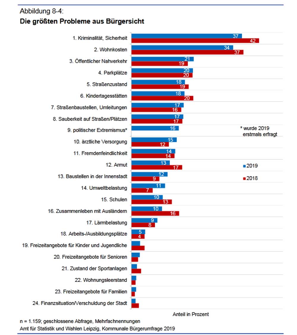 Davon benannten 20 Prozent die Infrastruktur, 17 Prozent die Politik, 15 Prozent die Verwaltung, 12 Prozent Connewitz, 10 Prozent die AfD sowie das Bevölkerungswachstum, 9 Prozent die Eisenbahnstraße und 7 Prozent die Polizei als eines der drei größten Probleme.“