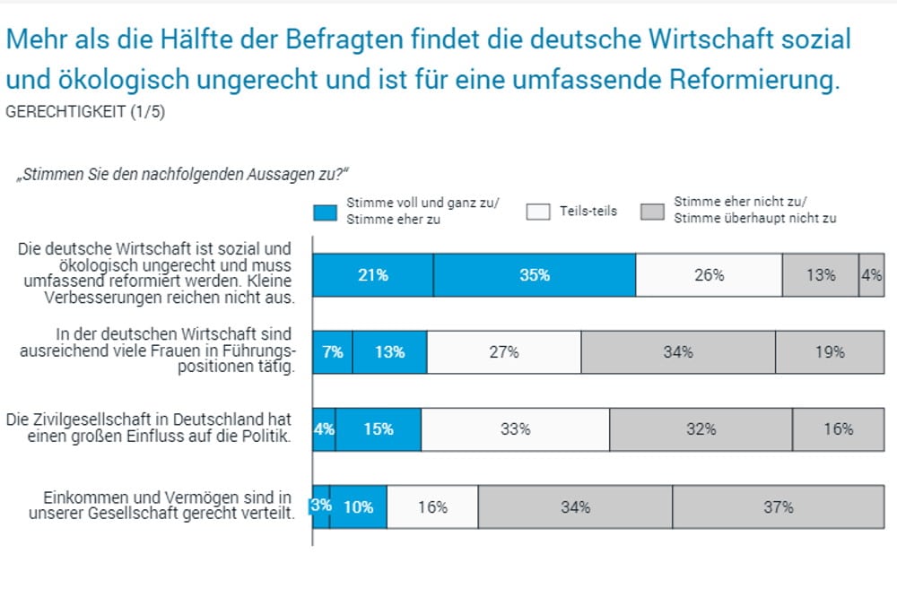 Nur jeder Fünfte Befragte (21 Prozent) hält das Wirtschaftssystem in Deutschland für sozial gerecht. 56 Prozent sind der Meinung, dass kleine Veränderungen nicht ausreichen, sondern die Wirtschaft umfassend reformiert werden muss.
