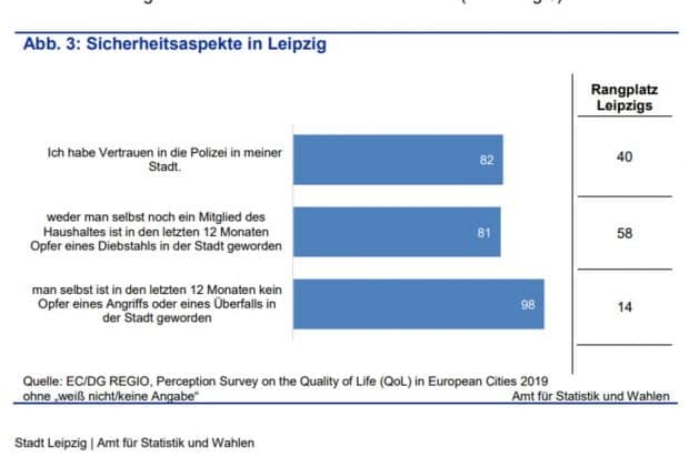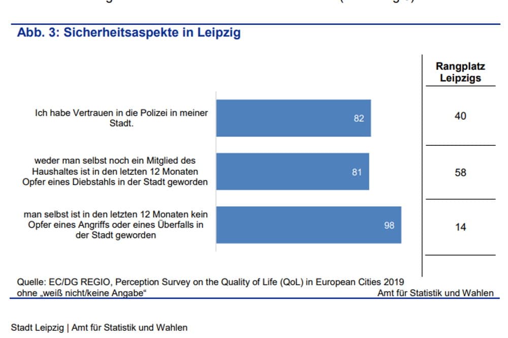 „In Leipzig geben 81 Prozent der Befragten an, dass weder sie selbst noch ein Mitglied ihres Haushalts in den letzten 12 Monaten Opfer eines Diebstahls geworden ist. In 58 anderen Städten lag dieser Anteil noch höher, sodass Leipzig hier knapp im hinteren Drittel rangiert. Am geringsten ist die Betroffenheit in Valletta (Malta, 94 Prozent), am höchsten in Skopje (Nordmazedonien, 56 Prozent). Schwerwiegendere Delikte wie Angriffe oder Überfälle sind in Leipzig im Vergleich zu den übrigen europäischen Städten hingegen seltener.“