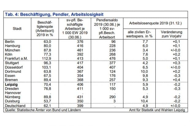 „In Frankfurt a. M. arbeiten demnach mehr Arbeitnehmer als Erwerbsfähige wohnen. Das heißt, eine große Zahl von Pendlern kommt tagtäglich zum Arbeiten in die Stadt, lebt aber außerhalb der Stadtgrenze. Die Pendlersalden bestätigen diesen Zusammenhang. Den mit Abstand größten Saldo je 1.000 sozialversicherungspflichtig Beschäftigter hatte 2019 Frankfurt a. M. mit 475,7. Es folgten Düsseldorf und Stuttgart mit ebenso sich deutlich absetzenden Pendlersalden von 407,0 und 377,0. Für beide Städte liegen nach Frankfurt a. M. auch die höchsten Beschäftigtenquoten in Höhe von 103,1 Prozent und 96,3 Prozent vor.