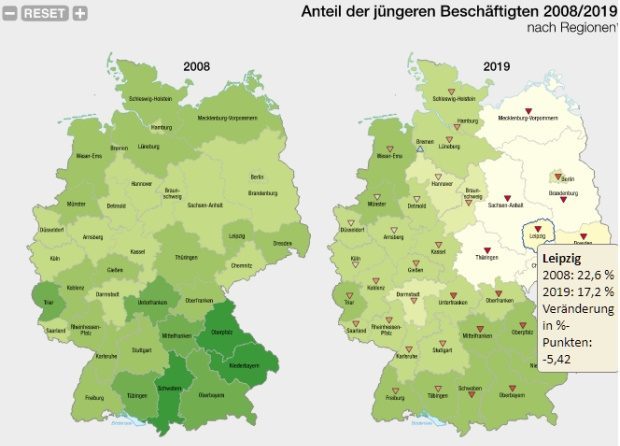 Der Anteil der unter 30-Jährigen an den sozialversicherungspflichtig Beschäftigten ist bundesweit nur geringfügig um zwei Prozentpunkte auf knapp 21 Prozent zurückgegangen. Die im „Nationalatlas aktuell“ des IfL veröffentlichten Karten zeigen allerdings große regionale Unterschiede. In der Oberpfalz, in Niederbayern, Schwaben und der Region Trier liegt der Anteil der jüngeren Erwerbstätigen weiterhin mehr als zehn Prozent über dem Bundesmittel. Dagegen verzeichnen die ostdeutschen Bundesländer mit Ausnahme von Berlin einen massiven Rückgang und rangieren mehr als zehn Prozent unter dem Bundesdurchschnitt.