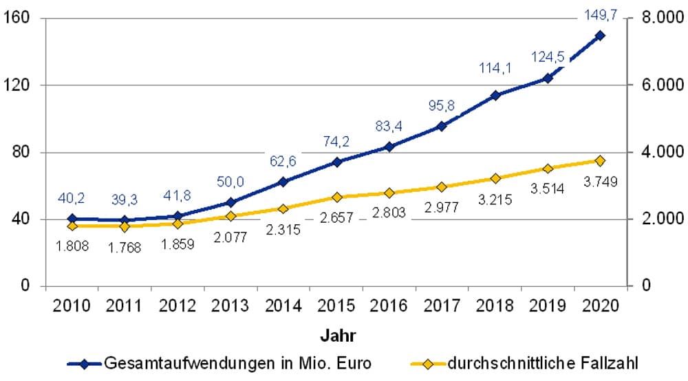 Entsprechend sind die Aufwendungen der Hilfen zur Erziehung deutlich angestiegen – von etwa 40 Millionen Euro im Jahr 2010 auf rund 149,7 Millionen Euro im Jahr 2020.