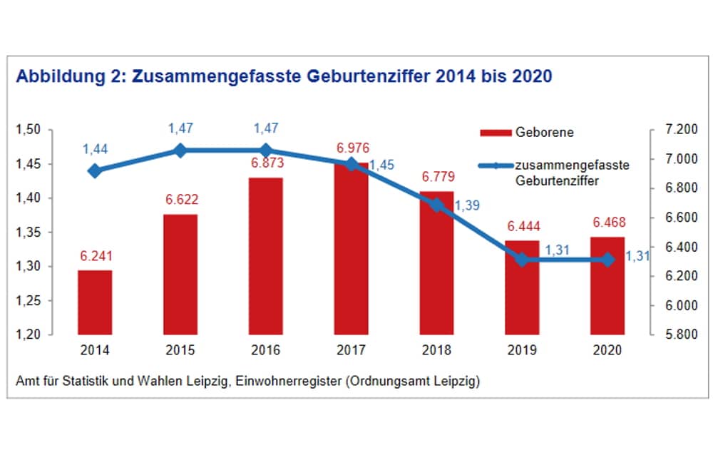 „6.468 Leipziger Kinder kamen im Jahr 2020 auf die Welt und damit vergleichbar viele wie im Jahr 2019 (6.444). 2017 erblickten noch 6.976 Leipziger Kinder das Licht der Welt“, kann man da lesen. „Dieses geburtenreiche Jahr 2017 stellt auch gleichermaßen den bisherigen Gipfelpunkt an Geborenen dar. Seit Ende der 1990er Jahren kamen in Leipzig von Jahr zu Jahr mehr Kinder zur Welt. Einfluss auf die Zahl der Geborenen hat zum einem die Anzahl potenzieller Mütter (und Väter), d. h. Frauen im fertilen Lebensalter, und zum anderen das Geburtenverhalten, d. h. die Geburtenhäufigkeit von Frauen.“