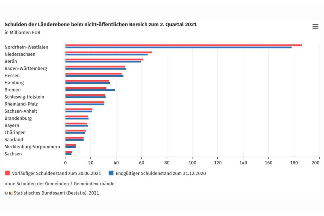 Samt dem Absatz zu Sachsen, der beim Bundesamt für Statistik so klang: „Die höchsten prozentualen Schuldenanstiege gegenüber dem Jahresende 2020 wiesen Sachsen (+11,0 %), Niedersachsen (+5,0 %) und Nordrhein-Westfalen (+4,4 %) auf. Die Schuldenanstiege in diesen Ländern sind hauptsächlich auf eine Ausweitung der Emission von Wertpapieren zurückzuführen. In Sachsen resultiert dieser zu einem großen Teil aus Aufnahmen von Wertpapieren für den Corona-Bewältigungsfonds sowie einer Umschichtung der Kreditaufnahmen vom bislang vornehmlich genutzten öffentlichen Bereich (z. B. bei verbundenen Unternehmen) zum nicht-öffentlichen Bereich.“