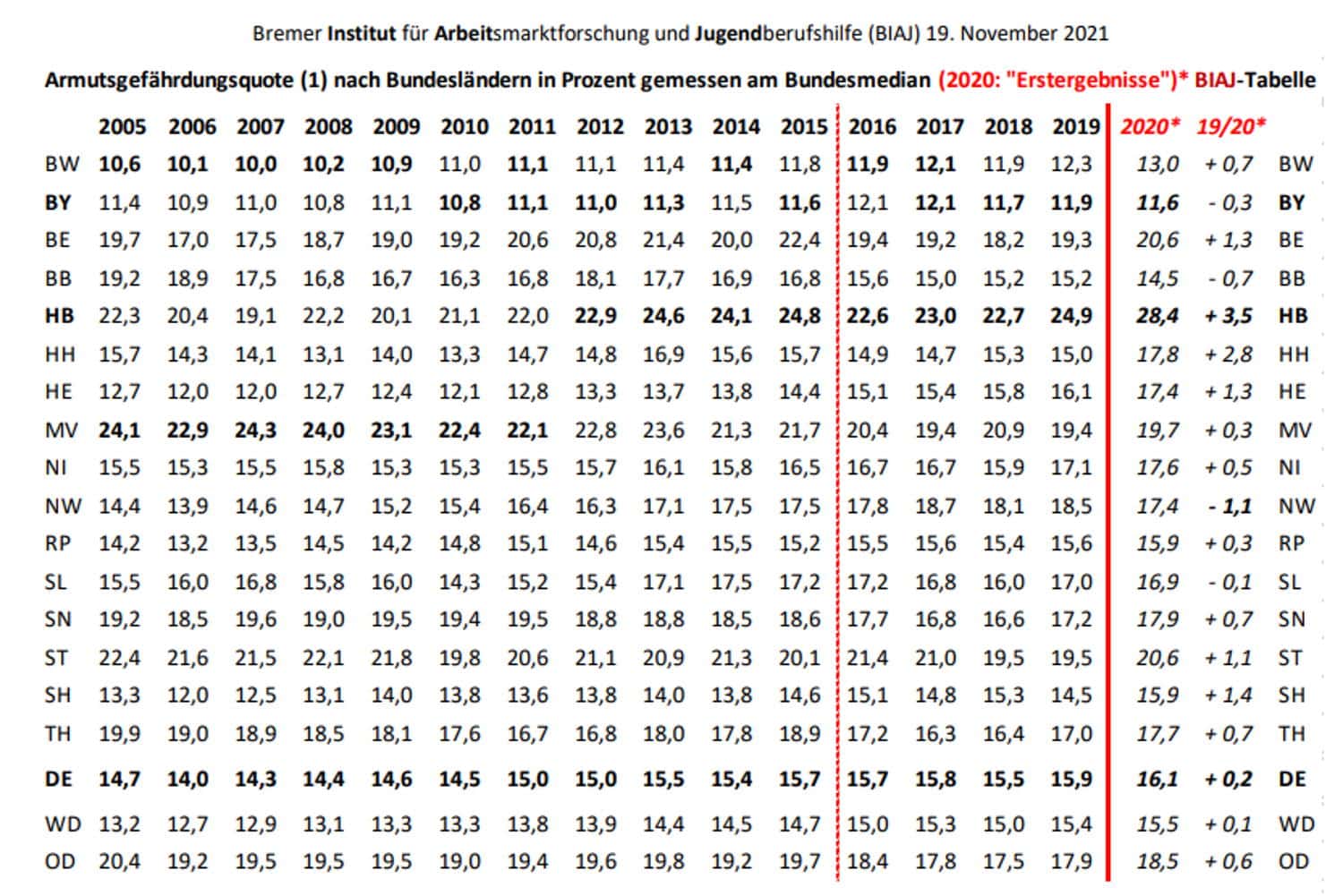 Die jüngste Statistik dazu hat wieder Paul M. Schröder vom Bremer Institut für Arbeitsmarktforschung und Jugendberufshilfe (BIAJ) erstellt – mit starkem Fokus auf das Bundesland Bremen, in dem sein Institut ansässig ist. Gleichzeitig hat sich ausgerechnet Bremen zum Problemfall in Sachen Armutsgefährdung entwickelt.