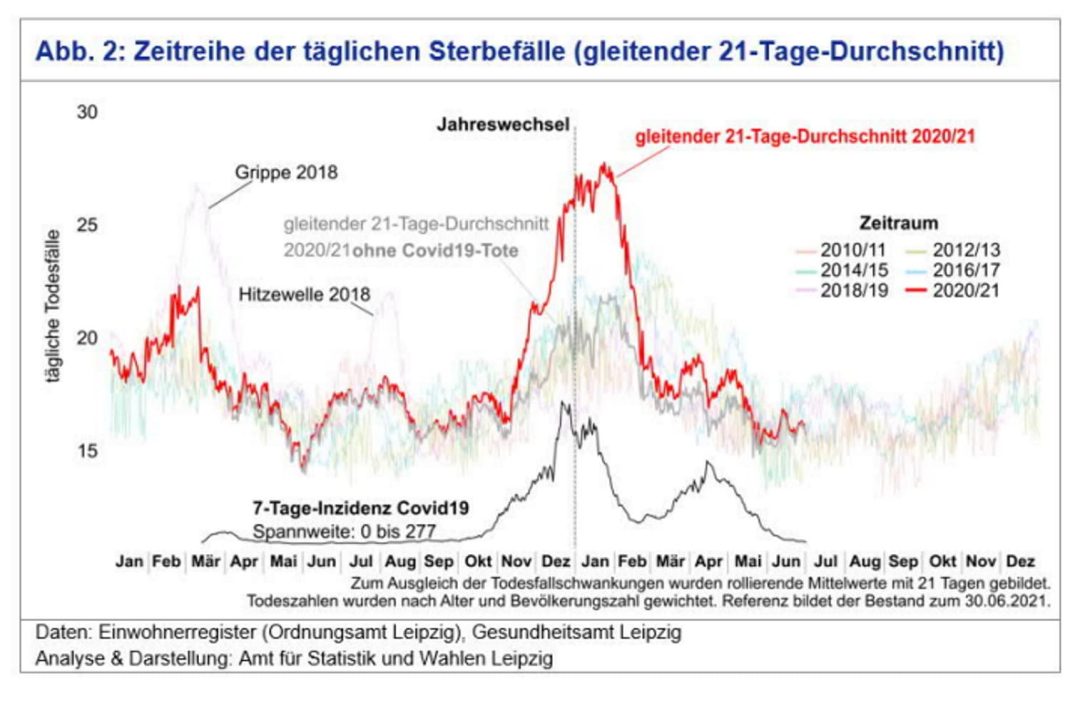 Man kann die Zahlen auch als einen gewissen Erfolg der Schutzmaßnahmen in Leipzig werten, denn die Auswertungen des Statistischen Landesamtes für Sachsen zeigen auch eine Übersterblichkeit schon ab den Jahrgängen der 65-Jährigen. Hier fielen insbesondere jene Landkreise mit erhöhten Sterbezahlen auf, in denen nach wie vor die Impfquote besonders niedrig ist und die Zahl der Impfverweigerer besonders hoch.