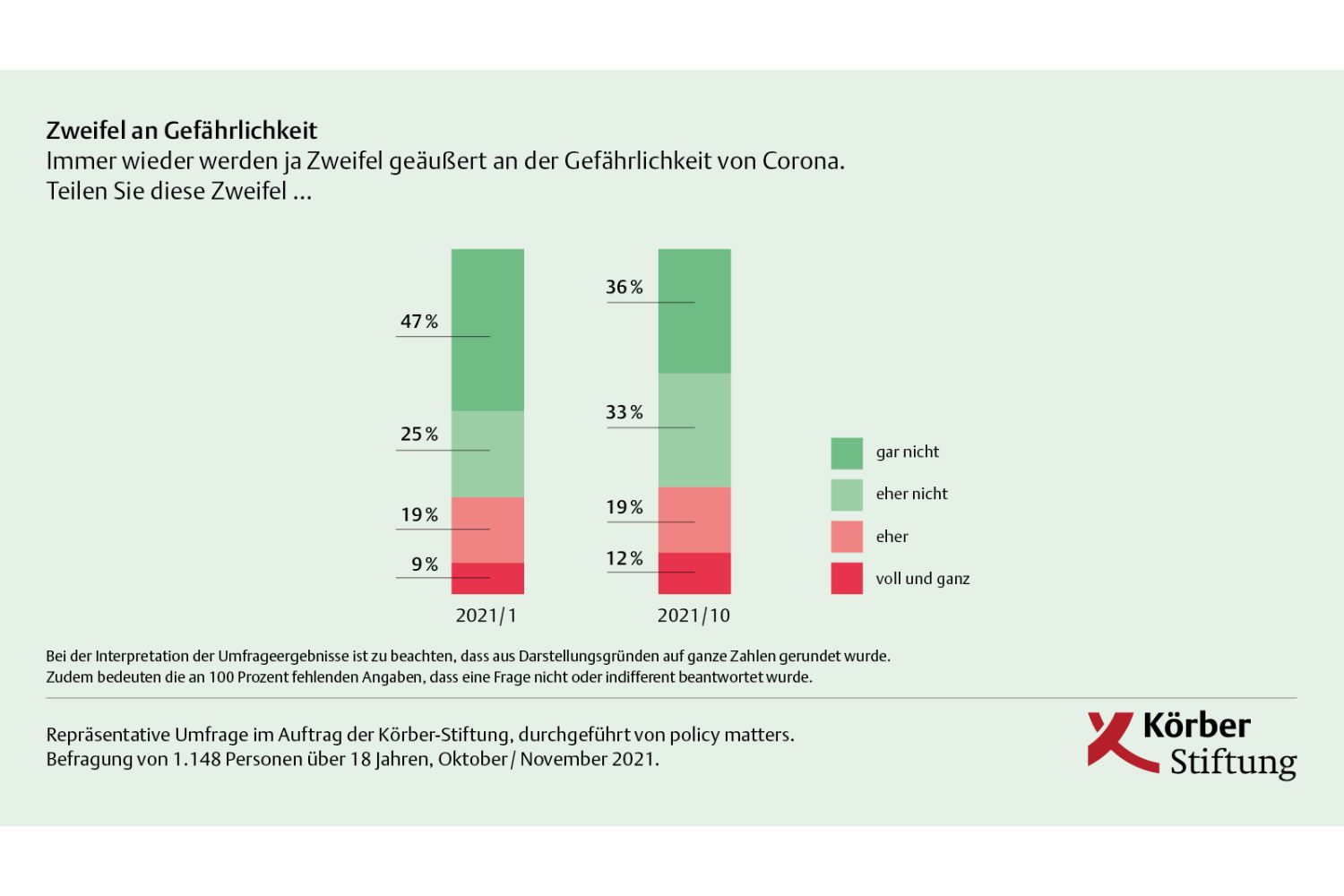 „Am stärksten ist der Zuspruch der Deutschen noch gegenüber der Wissenschaft (67 Prozent) und dem Bundesverfassungsgericht (55 Prozent) ausgeprägt“, liest die Körber-Stiftung noch aus den Zahlen heraus. Man kann die Zahlen also auch so interpretieren, dass Anfang 2020 die Erwartungen an alle staatlichen Institutionen sehr hoch waren, dass sie die Pandemie und die Folgen schnell und gut bewältigen würden. Was sich aber als Illusion erwiesen hat.