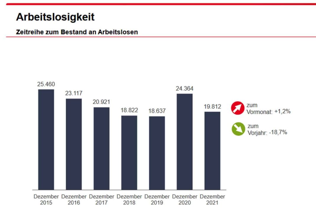 Die Zahl der Arbeitslosen in Leipzig ist im Dezember zwar um 236 auf 19.812 in der Arbeitsagentur und dem Jobcenter gemeldeten Personen angestiegen. Aber im Vergleich zum Dezember 2020 sank die Arbeitslosigkeit um 4.552 Personen.