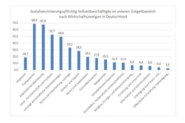 Obwohl unter diesem Druck immer größere Betriebe mit immer weniger Beschäftigten entstanden sind, ist die Landwirtschaft nach dem Gastgewerbe mit 68,9 % und der Leiharbeit (Arbeitnehmerüberlassung) mit 67,9 % der Wirtschaftsbereich, der mit 52,7 % den größten Niedriglohn-Anteil hat.