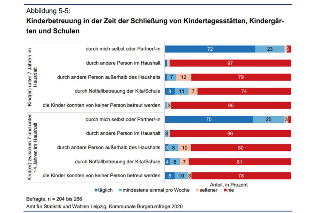 Wenn es Kinder im Haushalt gab, fanden nur 5 Prozent der Befragten überhaupt Ausweichmöglichkeiten für ihre Betreuung. Womit zumindest die Stadt Leipzig jetzt auch schwarz auf weiß hat, dass unsere Gesellschaft im Grunde keine Puffer hat, wenn Kindereinrichtungen über längeren Zeitraum geschlossen werden müssen. Die Last liegt fast ausschließlich bei den jungen Eltern, die dann natürlich auch am Arbeitsplatz ausfallen, wenn sie nicht auch noch die Zusatzbelastung Homeoffice auf sich nehmen können.
