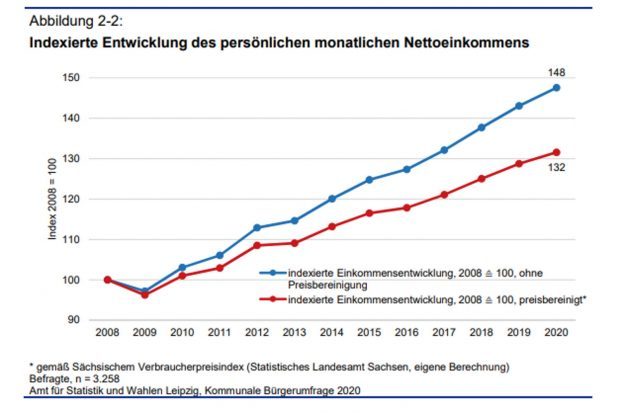 „Die Einkommen in Leipzig steigen auch im Jahr 2020 weiter an: Das mittlere persönliche Nettoeinkommen in Leipzig liegt 2020 bei rund 1.480 Euro, 3,1 Prozent höher als im Vorjahr. Verglichen mit dem Jahr 2008 liegen die realen (preisbereinigten) Einkommen der Leipzigerinnen und Leipziger im Mittel um 31 Prozent höher. Die Lücke zwischen den Einkommen von Männern und Frauen verkleinert sich gegenüber dem Vorjahr leicht. Das mittlere Haushaltsnettoeinkommen steigt um 3,2 Prozent auf rund 1.970 Euro. In realen Größen verfügt der mittlere Leipziger Haushalt damit über ein um 27 Prozent höheres Einkommen als 2008“, liest man im Bericht.