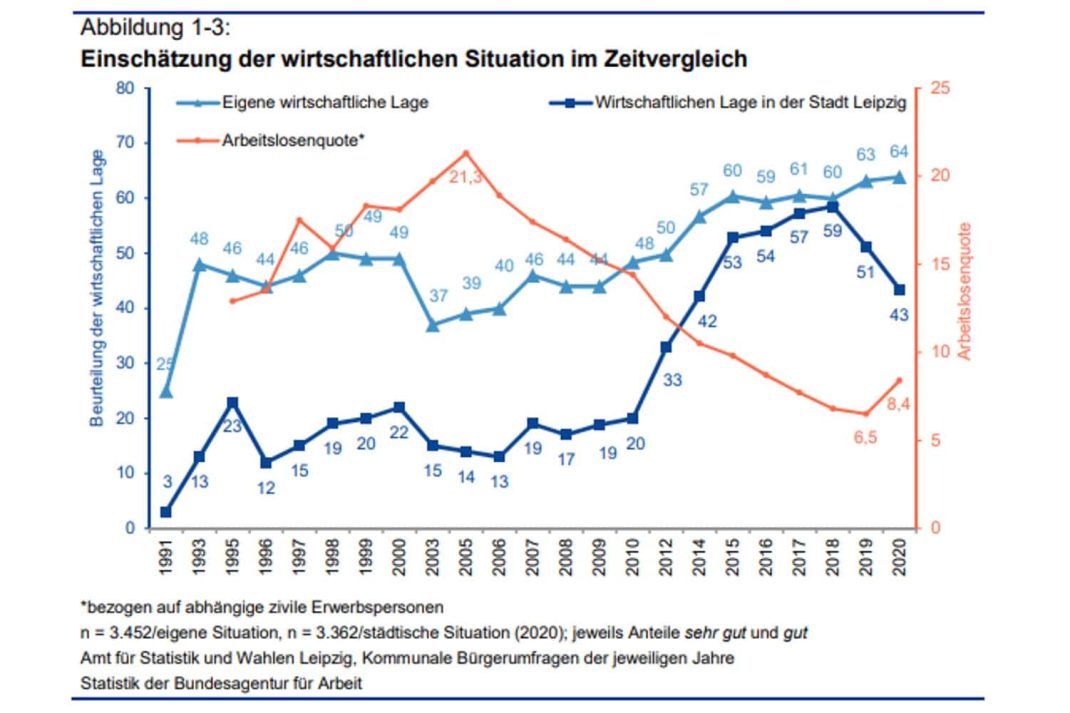 Aber solche in einigen Blättern der Stadt breit ausgewalzten Angstszenarien bestimmen natürlich das Bild, das sich die Leipziger von der wirtschaftlichen Lage ihrer Stadt machen. Und so überrascht auch nicht, dass in der Bürgerumfrage 2020 die wirtschaftliche Einschätzung der Stadt in den Keller rauscht, während fast alle Befragten bekunden, dass sich ihre eigene wirtschaftliche Lage nicht verschlechtert, teilweise sogar verbessert hat.