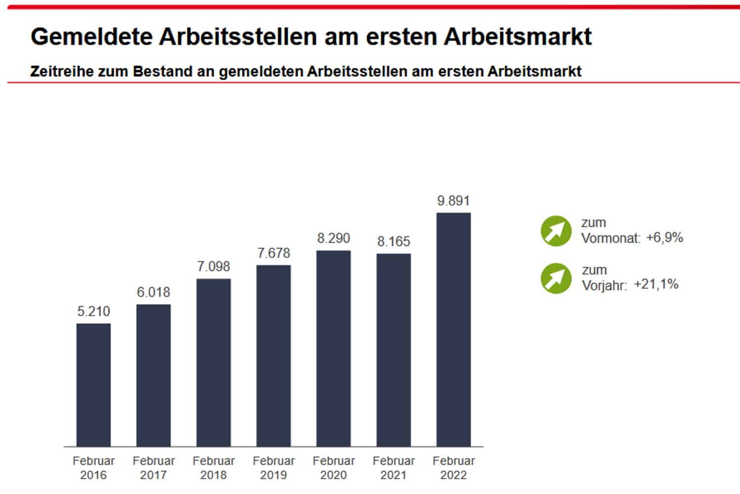 Dass es aber um mehr geht als die gefragten Saisonarbeitskräfte, macht die Statistik der als frei gemeldeten Stellen sichtbar. Denn deren Zahl strebt jetzt ziemlich beharrlich auf die 10.000er-Marke zu.