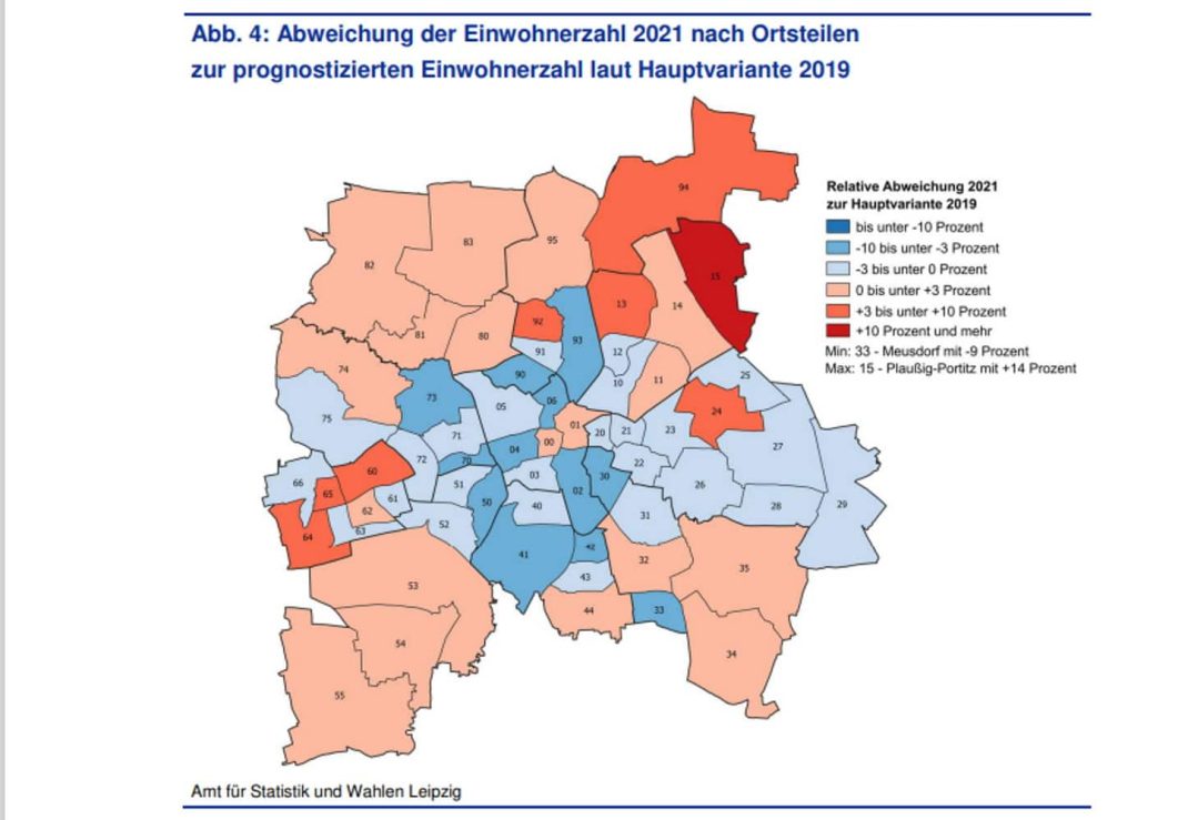 „Die größte Überschätzung ergab sich dagegen in Plaußig-Portitz, wo Ende 2021 rund 440 Personen mehr gemeldet sind als prognostiziert (+14 Prozent). Insbesondere in Teilen Grünaus, in Paunsdorf sowie den Ortsteilen des südlichen und nördlichen Stadtrandes entwickelte sich die Einwohnerzahl in den ersten drei Prognosejahren positiver als prognostiziert. Ortsteile im Innenstadtbereich, am Innenstadtrand sowie im Stadtbezirk Ost blieben dagegen hinter der erwarteten Einwohnerentwicklung zurück.“