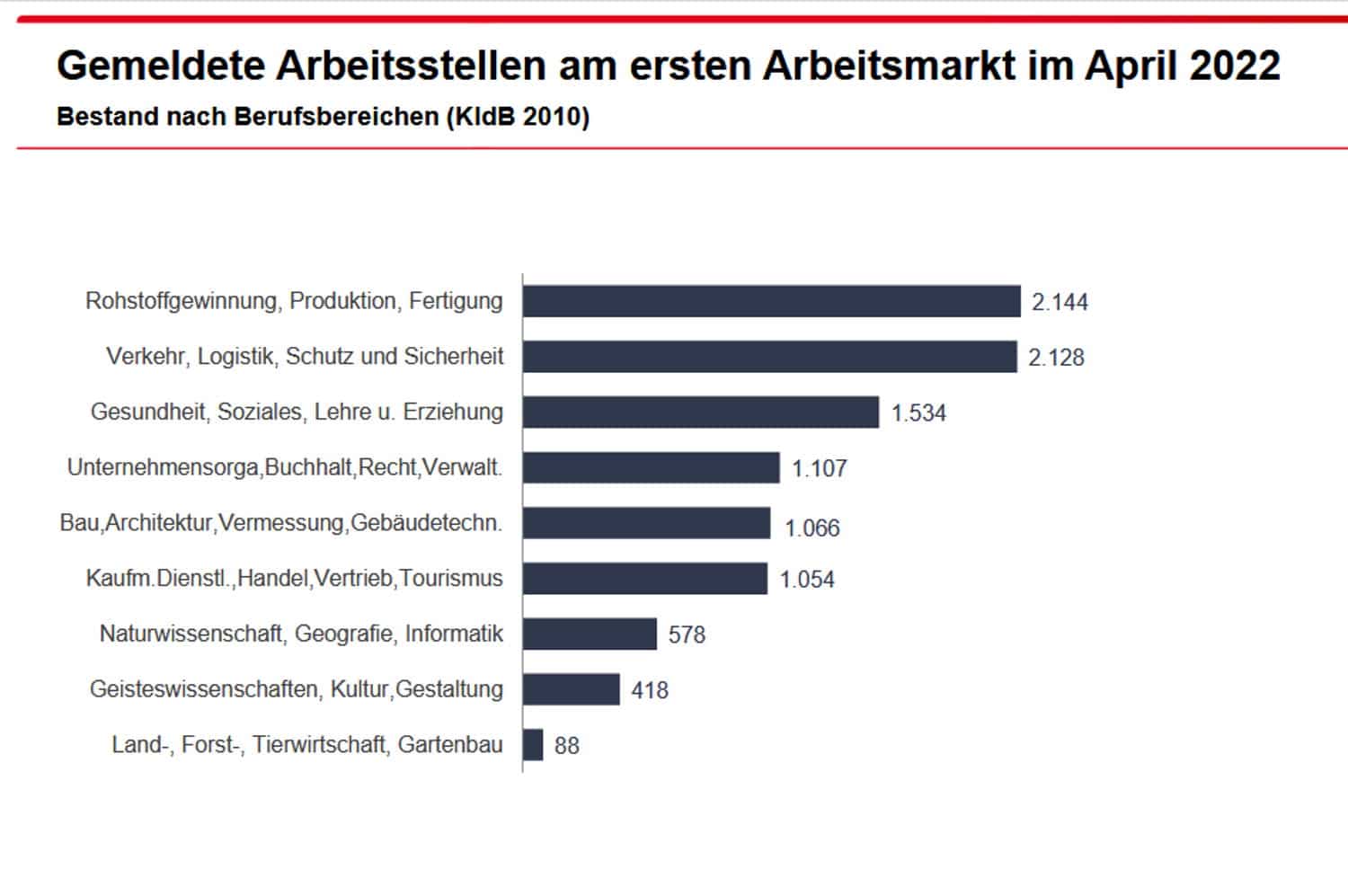 „Im Vergleich zum Vorjahresmonat gab es 2.027 Stellen mehr (+25,1 Prozent). Unternehmen meldeten im April 1.813 neue Arbeitsstellen, das waren 455 oder 33,5 Prozent mehr als ein Jahr zuvor. Seit Jahresbeginn sind damit 6.754 Stellen eingegangen, das ist ein Zuwachs gegenüber dem Vorjahreszeitraum von 1.287 oder 23,5 Prozent.