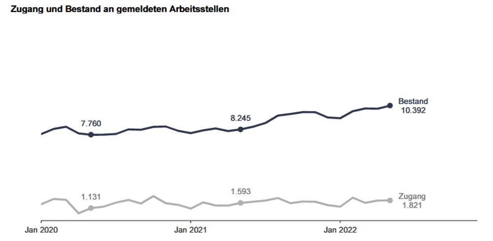 Dem stehen derzeit 2.193 Bewerberinnen und Bewerber für einen Ausbildungsplatz gegenüber. Dies entspricht einem Rückgang von 161 Personen bzw. -6,8 Prozent im Vergleich zum Mai 2021.
