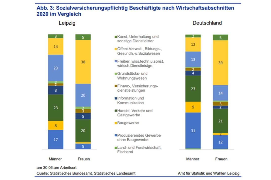 „Dies geht aus dem aktuellen statistischen Quartalsbericht für die ersten drei Monate des Jahres 2022 hervor, der sich in einem Beitrag mit der Gleichstellung von Frauen und Männern in Leipzig befasst. Demzufolge arbeiten Frauen überwiegend und häufiger als Männer in der öffentlichen Verwaltung, im Bildungs-, Gesundheits- und Sozialwesen sowie im Handel, Verkehr und Gastgewerbe, und damit in eher geringer entlohnten Bereichen. Zudem sind sie häufiger in Teilzeit beziehungsweise in geringfügiger Beschäftigung tätig. Im Zuge der Corona-Pandemie waren die Leipzigerinnen um fünf Prozentpunkte seltener als die Leipziger von Kurzarbeit, Kündigung oder einer Insolvenz betroffen.