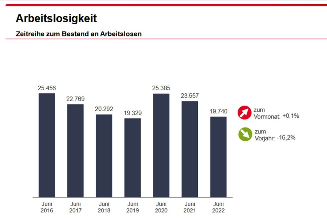 Im Vergleich zum Juni 2021 gab es 1.987 Langzeitarbeitslose weniger, ein Rückgang um 22,4 Prozent.