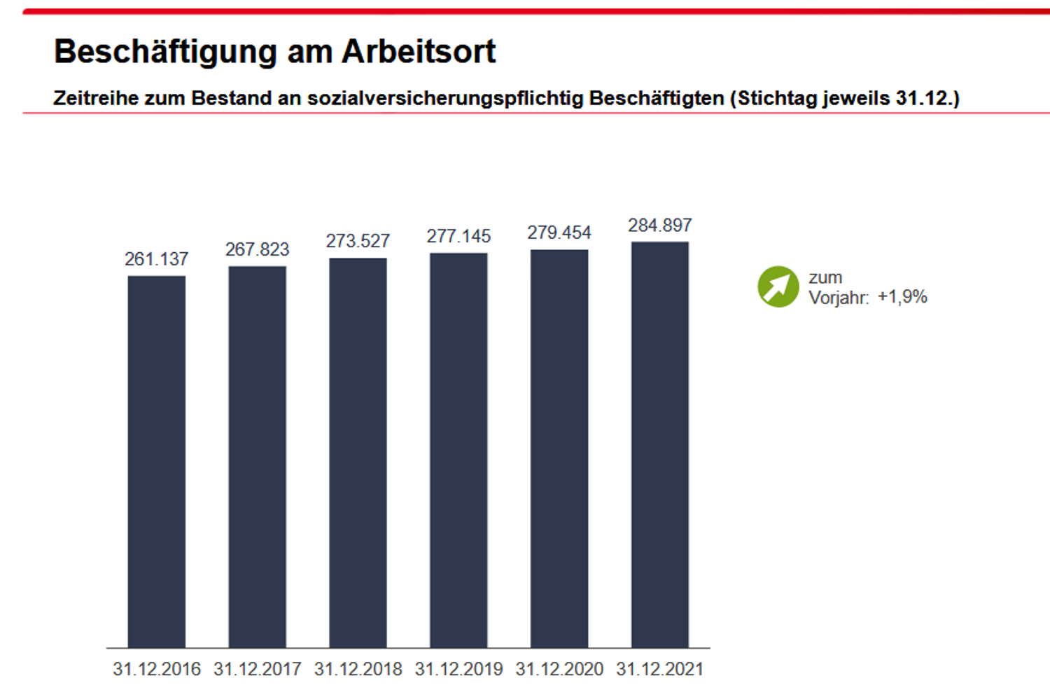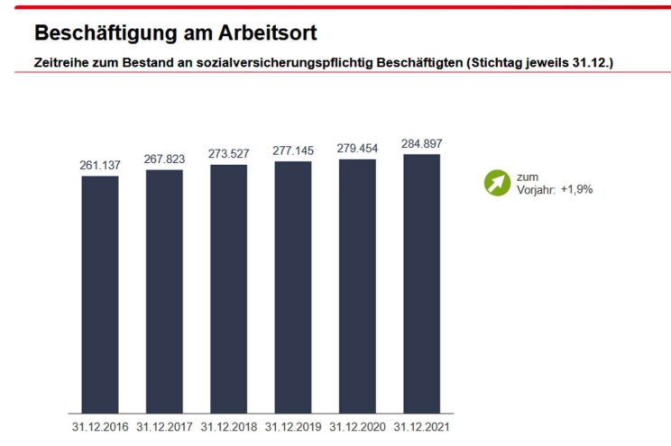 Und wie stark der Leipziger Arbeitsmarkt wächst, zeigt auch die jüngste Zahl zu den sozialversicherungspflichtig Beschäftigten: In Leipzig gab es Ende Dezember 2021 (aktuellster Berichtsstand) einen Anstieg auf 284.897 sozialversicherungspflichtig Beschäftigte. Das waren im Vergleich zum Vorquartal 1.193 Personen bzw. 0,4 Prozent mehr. Im Vergleich zum Dezember 2020 gab es 5.443 sozialversicherungspflichtig Beschäftigte mehr, ein Zuwachs um 1,9 Prozent.