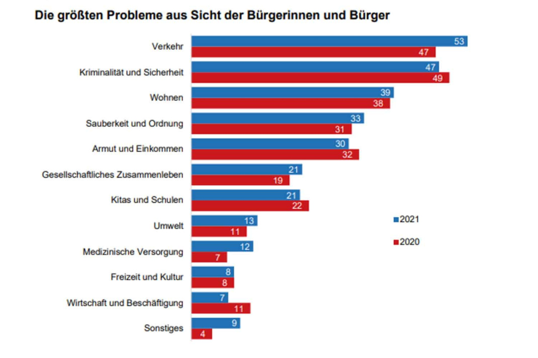 Und nur um das zu ergänzen: Allein die Nennung von Parkplatzsituation bei 49 Prozent der Befragten und des ÖPNV bei 48 Prozent hätte genügt, um diese beiden Items vor „Sicherheit und Ordnung“ an die Spitze der Problemliste zu bringen.