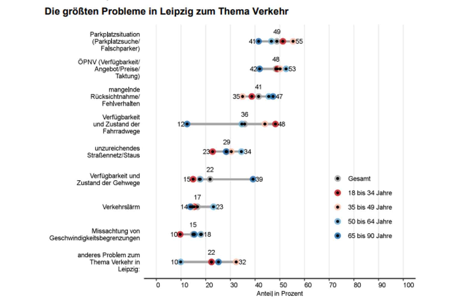 Doch auch Leipzigs Spezialistinnen und Spezialisten in Sachen Statistik wollten wissen, warum Verkehr nun auf einmal ganz vorn liegt im Ranking der Sorgen. „Bei der Einschätzung der größten Probleme löst Verkehr das im Vorjahr am stärksten wahrgenommene Problem Kriminalität und Sicherheit ab. Auffällig ist überdies, dass die einkommensbezogenen Problemfelder, welche im ersten Jahr der Corona-Pandemie an Bedeutsamkeit gewannen, nun wieder etwas zurückgehen: Wirtschaft und Beschäftigung -4 Prozentpunkte, Armut und Einkommen -2 Prozentpunkte“, kann man im Bericht lesen.