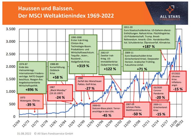 Walter Schmitz. Wie bereits erwähnt, habe ich seit den 1960er Jahren vieles erlebt. Die Börsen sind mehr als einmal Achterbahn gefahren. Es gab – gefühlt – unzählige Crashes. Doch auch viele Haussen, während derer die Aktienmärkte über Jahre hinweg nur eine Richtung kannten – nach oben. (siehe Chart).