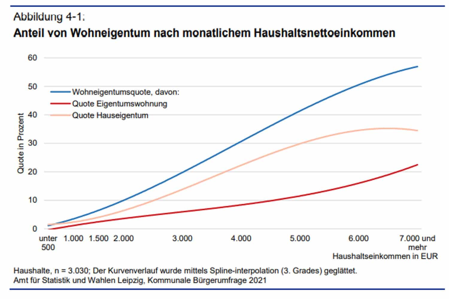 Wie eng der Erwerb von Wohneigentum mit dem Einkommen gekoppelt ist, beschreibt der Bericht zur Bürgerumfrage 2021 so: „Während die Haushalte mit niedrigem Einkommen nur zu einem sehr geringen Anteil im Eigentum wohnen, lebt über die Hälfte (55 Prozent) der Haushalte mit einem monatlichen Haushaltsnettoeinkommen von 7.000 Euro und mehr in einer Eigentumswohnung (24 Prozent) oder einem Eigenheim (31 Prozent).“