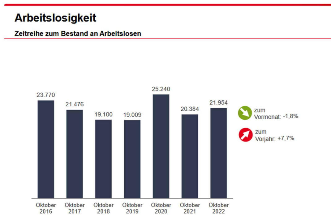 Das machen auch die konkreten Zahlen zur Bewegung auf dem Arbeitsmarkt deutlich: 5.915 Personen meldeten sich im Oktober arbeitslos, 994 mehr als vor einem Jahr. Dagegen kamen (nur) 6.301 Arbeitssuchende wieder in Arbeit, 239 weniger als vor einem Jahr.
