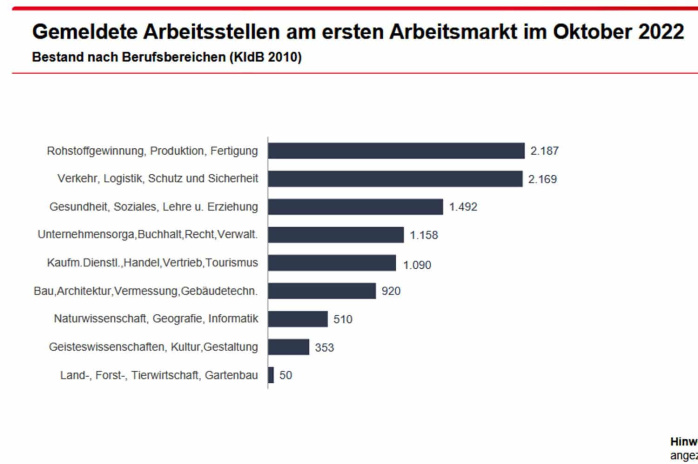 Wobei auffällt, dass vor allem das Stellenangebot im verarbeitenden Gewerbe zurückging und dafür deutlich mehr Personal für Verkehr und Logistik gesucht wird. Während die Nachfrage in Gesundheitswesen, in der Bildung, selbst bei Verwaltung und Buchhaltung, in der IT-Branche und auch am Bau unvermindert anhält.