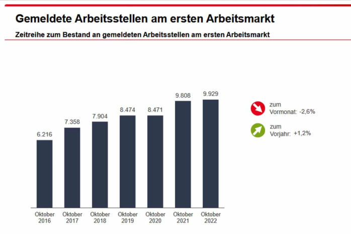 Vorerst wirkt sich die Unsicherheit darin aus, dass seit Monaten die Zahl der als frei gemeldeten Arbeitsstellen wieder unter die 10.000er-Marke rutschte: 9.929 waren es im Oktober, 261 weniger als im September. Aber gegenüber dem Vorjahr waren es trotzdem 121 mehr. Der Bedarf an Fachkräften bleibt also weiterhin hoch.