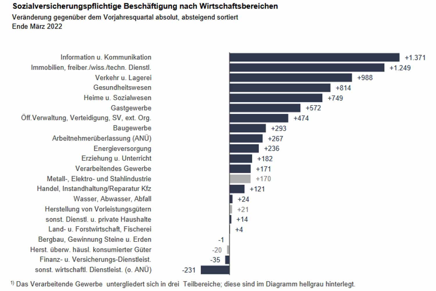 Und da liegt mit 1.371 zusätzlich geschaffenen Stellen die IT-Branche ganz vorn, gefolgt von „Immobilien, freiberuflichen/wissenschaftlich./technischen Dienstleistern“ mit 1.249 neuen Arbeitsstellen und dem Wachstumssegment Verkehr und Logistik mit 988 zusätzlichen Stellen. Ganz ähnlich baut das Gesundheitswesen seinen Personalbestand auf – plus 814 Stellen übers Jahr (Stand März).