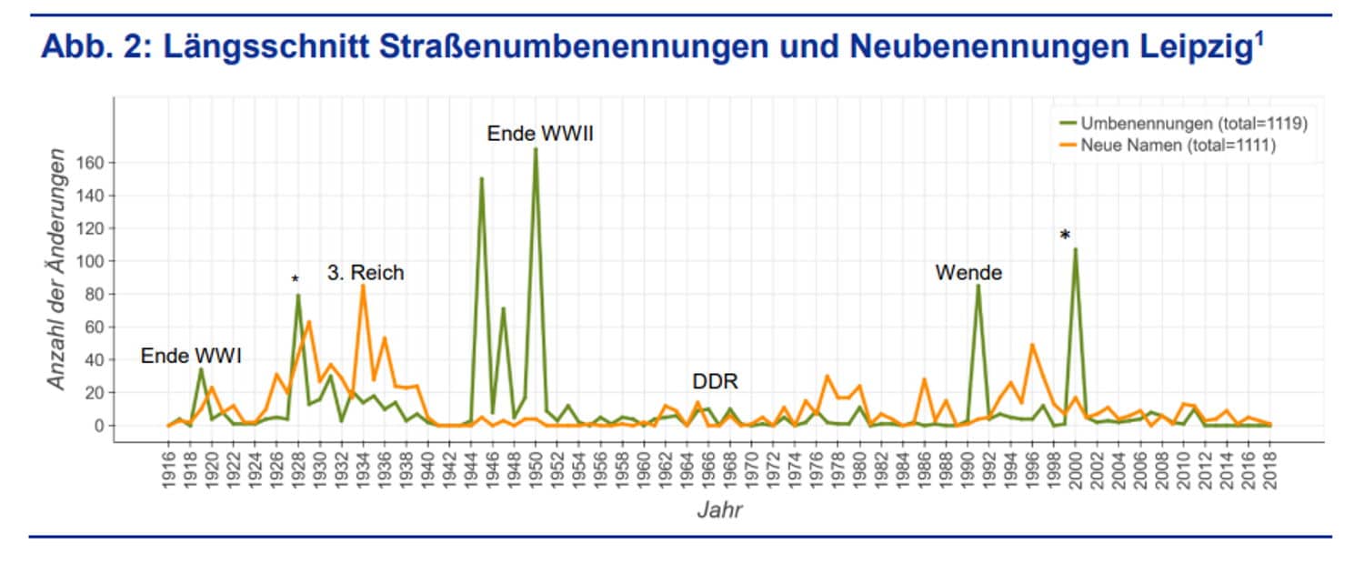 Straßenum- und -neubenennungen in Leipzig 1916 bis 2018. Grafik: Stadt Leipzig, Quartalsbericht 2 / 2022