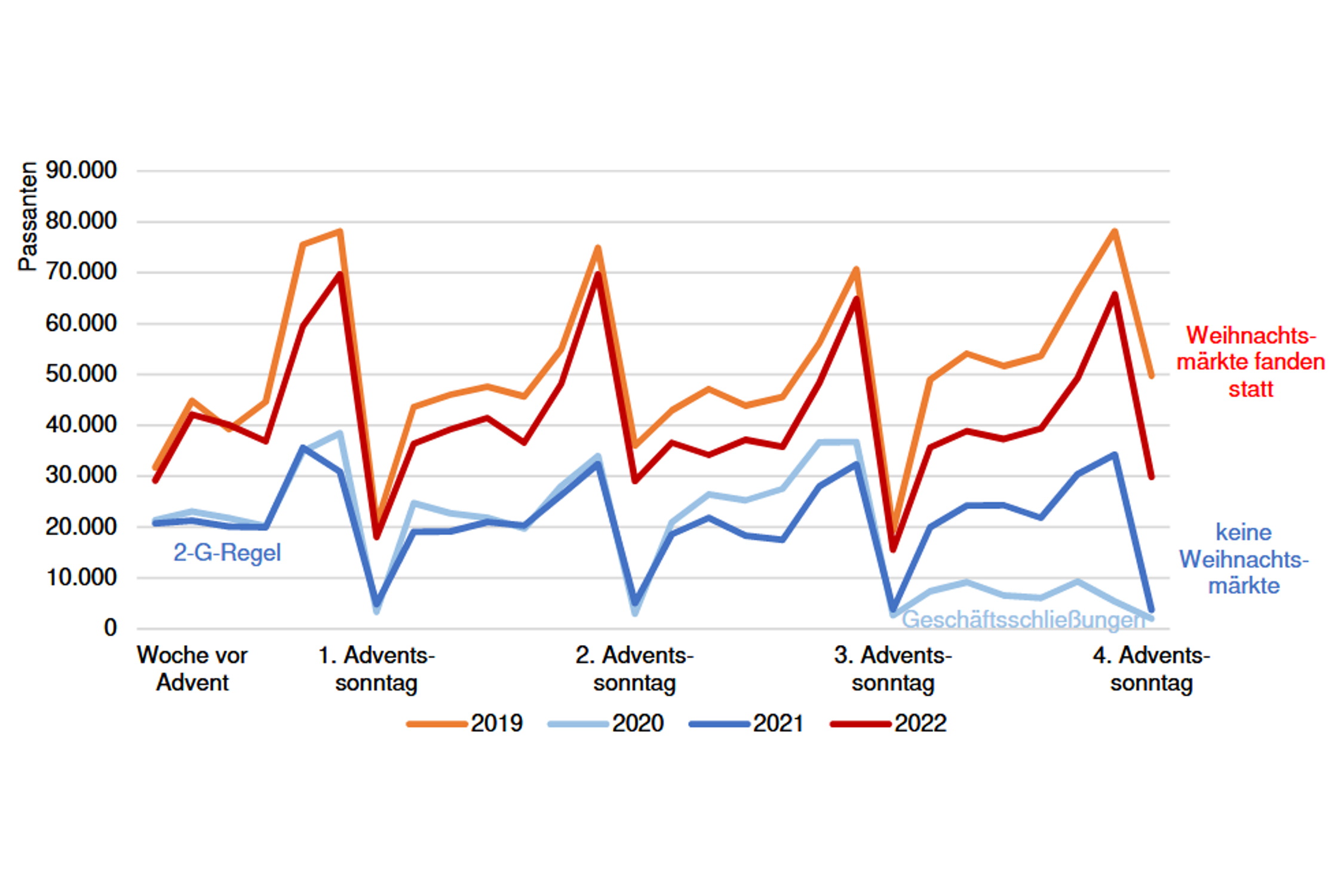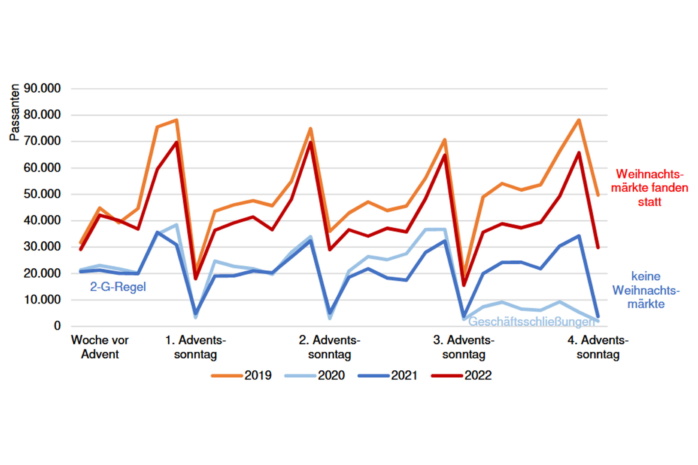 Gerade während des Weihnachtsgeschäftes führten pandemiebedingte Maßnahmen wie Geschäftsschließungen oder die 2-G-Regel dazu, dass in den Vorjahren deutlich weniger Menschen überhaupt den Weg in die Innenstadt fanden. Hinzu kam, dass in beiden Jahren der innerstädtische Weihnachtsmarkt abgesagt werden musste, der Besuchermagnet ist.