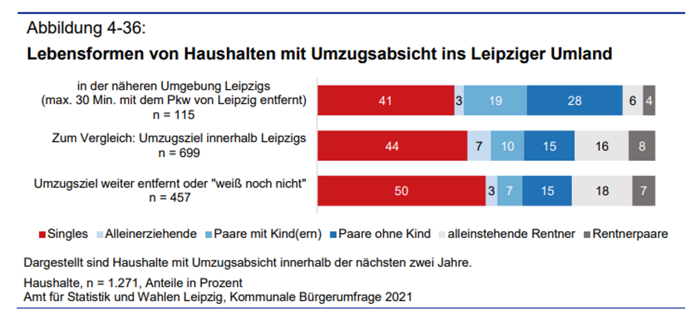 Schon in der „Bürgerumfrage 2021“ stand dazu die etwas irritierende Aussage: „Die Struktur der Haushalte, die in den nächsten zwei Jahren (möglicherweise) ins Leipziger Umland ziehen möchten, unterscheidet sich deutlich von den anderen Zielgebieten. Die Hälfte der Haushalte sind Paare mit und ohne Kind(ern). Damit liegt der Anteil der Paarhaushalte ungefähr doppelt so hoch wie bei innerstädtischen Wanderungen oder bei Fernwanderungen.“