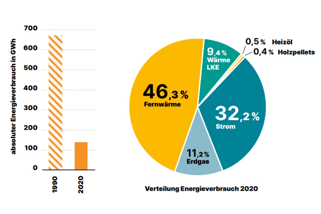 Beim Vergleich des tatsächlichen Energieverbrauchs wird dann deutlich, dass die Heizversorgung mit Fernwärme bei rund 80 GWh (und einem Anteil von 65 Prozent 2017) über die Jahre sogar relativ konstant war. Dafür ist schon weit vor Putins Angriffskrieg auf die Ukraine sichtbar, wie der Verbrauch von Erdgas zum Beheizen städtischer Gebäude deutlich zurückging – von 40 und 38 GWh in den Jahren 2016 und 2017 auf 34 GWh im Jahr 2019. Die 19,57 GWh im Jahr 2020 gehen zum größten Teil auf das Konto der zunehmend aktiveren LKE, die 2020 schon 16,38 GWh gesamt als Heizenergie lieferte – und darin natürlich auch Erdgas.