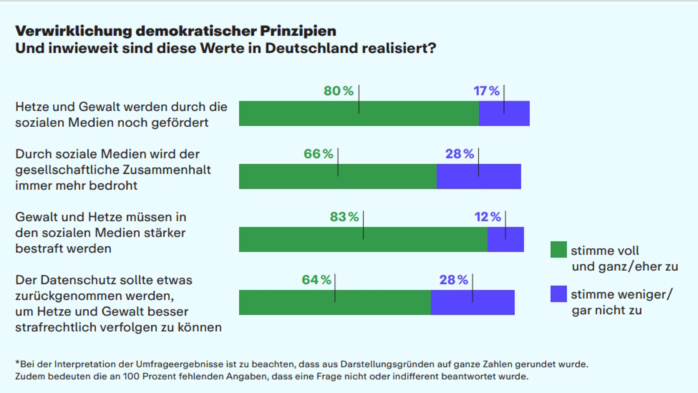 80 Prozent der Befragten bestätigen die Aussage „Hetze und Gewalt werden durch die sozialen Medien noch gefördert“. 66 Prozent finden „Durch soziale Medien wird der gesellschaftliche Zusammenhalt immer mehr bedroht“. Und 83 Prozent wünschen sich: „Gewalt und Hetze müssen in den sozialen Medien stärker bestraft werden.“
