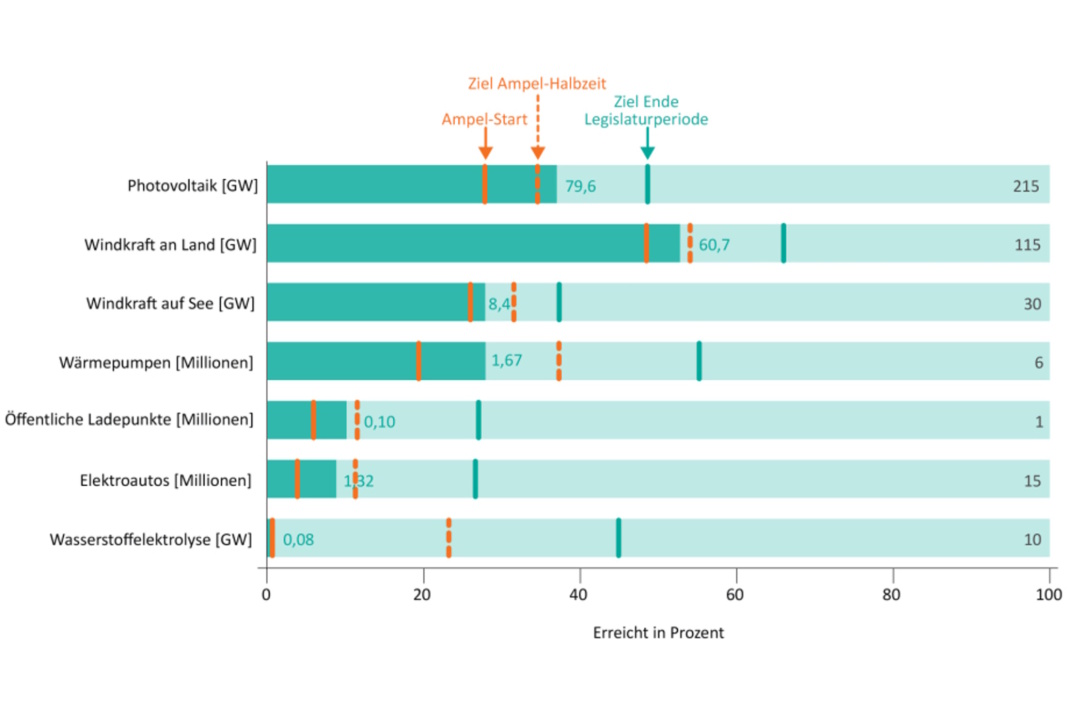 „Mit ambitionierten energiepolitischen Zielen hat die Ampel-Regierung vor zwei Jahren ihre Arbeit aufgenommen. Zur Halbzeit der Legislaturperiode ist die Erfolgsbilanz gemischt – in einzelnen Bereichen sind gute Fortschritte erzielt worden, in anderen klaffen große Lücken zwischen Ist- und Sollzustand“, so das Deutsche Instituts für Wirtschaftsforschung (DIW Berlin) zu seinem Ampel-Monitor Energiewende, der aufzeigt, „wo wir heute bei wichtigen Technologien für die Transformation zur Klimaneutralität stehen“.
