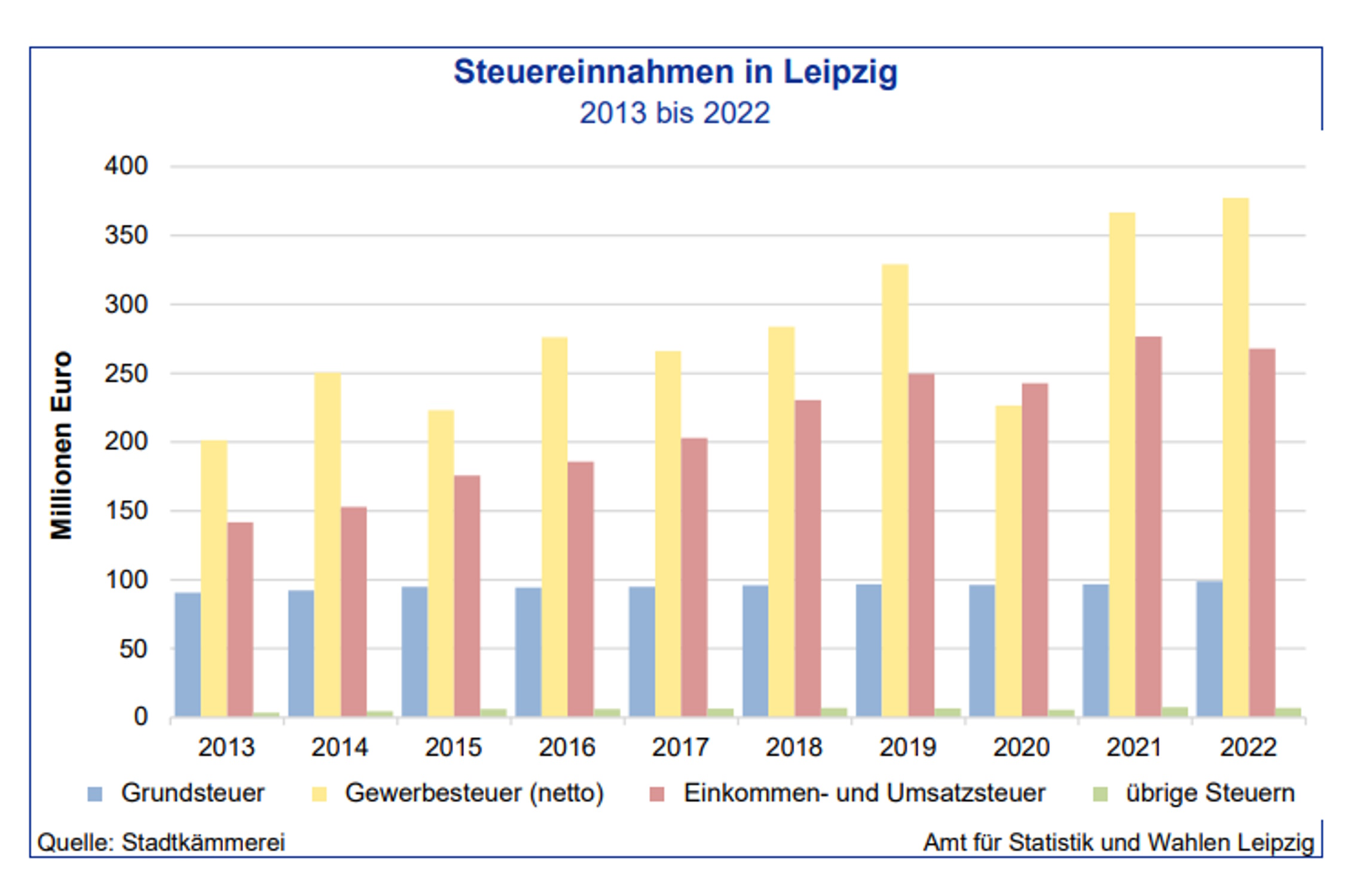Im letzten Jahr vor Corona hatten die Steuereinnahmen Leipzigs den damaligen Spitzenwert von 682 Millionen Euro erreicht. Im ersten Corona-Jahr 2020 sanken die Steuereinnahmen auf 572 Millionen Euro. Doch schon 2021 berappelten sie sich auf 748 Millionen Euro – den bis dahin höchsten Wert seit der Wiedervereinigung.