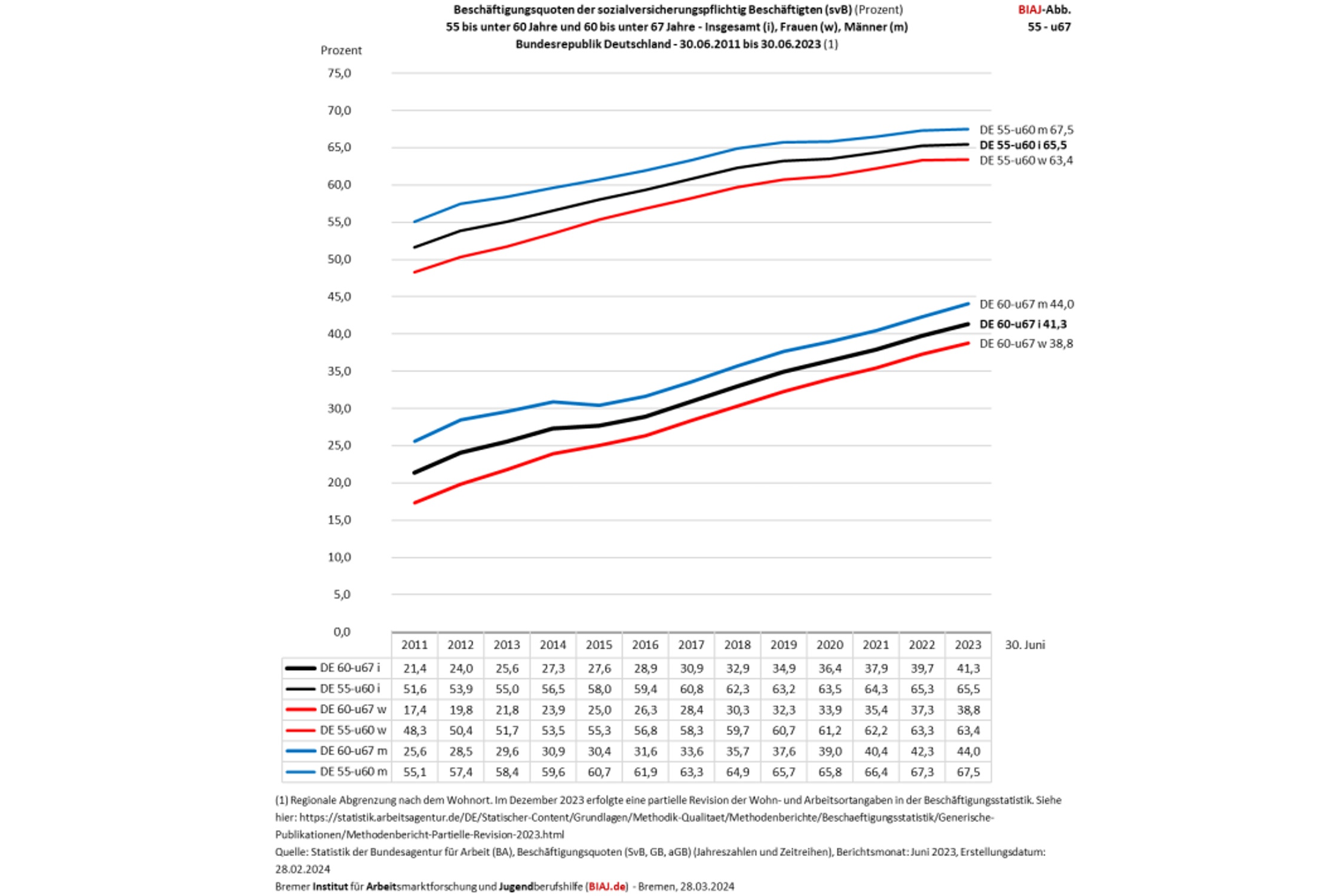 Und genau das bildet sich in der von Paul M. Schröder erarbeiteten Grafik ab, die nicht nur zeigt, wie die Beschäftigungsquoten der Frauen und Männer zwischen 55 und 60 Jahren von 51,6 Prozent im Jahr 2014 auf 65,5 Prozent im Jahr 2023 angestiegen sind, ein sicheres Zeichen dafür, dass immer weniger Beschäftigte in den Vorruhestand gehen.