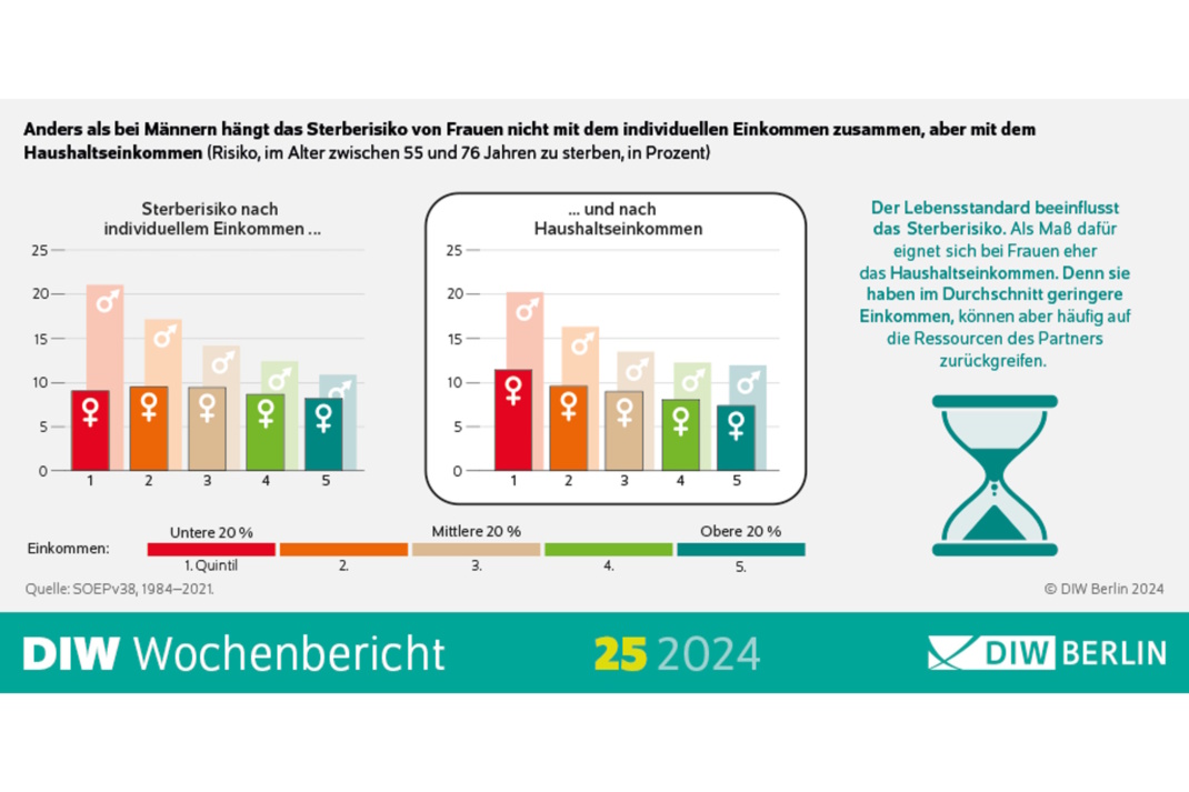 „Die Lebenserwartung wird maßgeblich vom Lebensstandard der Menschen beeinflusst. Frauen haben durchschnittlich geringere individuelle Einkommen, können dabei jedoch häufig auf die Ressourcen ihres Partners zurückgreifen. Für sie ist daher das Haushaltseinkommen das bessere Maß, um ihren Lebensstandard zu messen“, erklärt Studienautor Johannes Geyer.