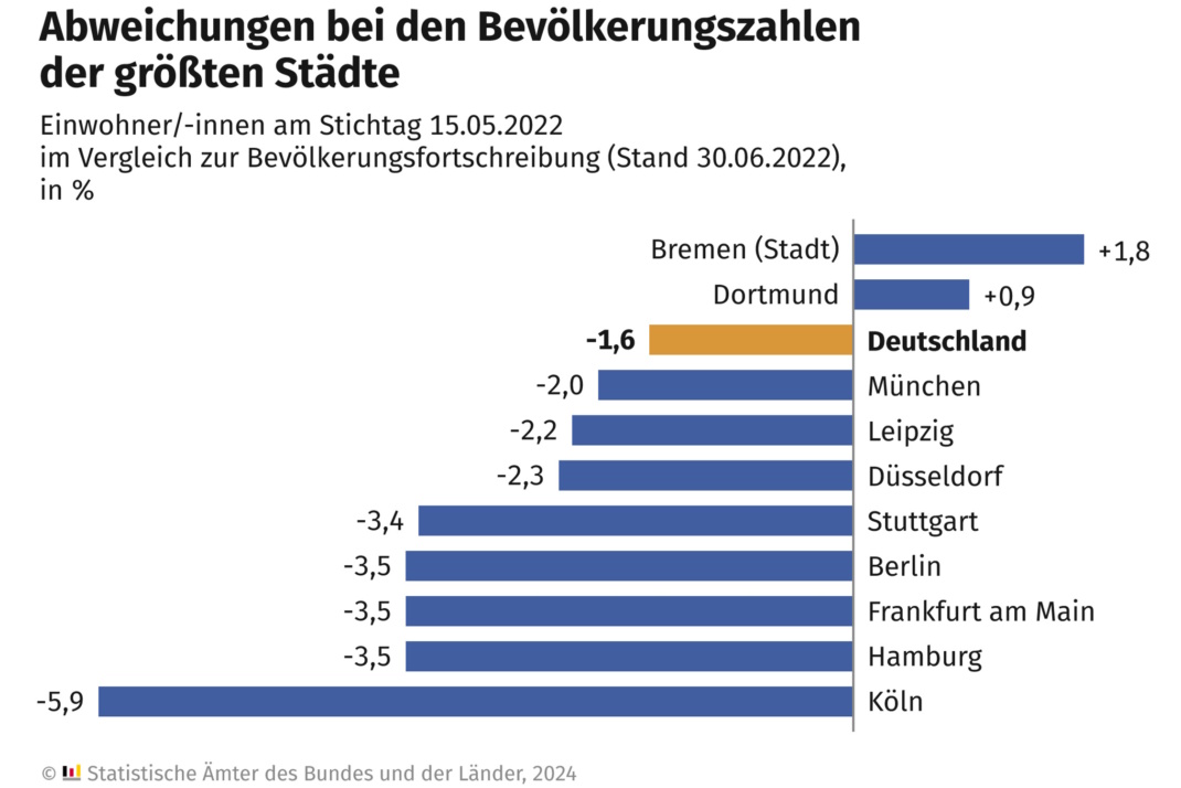 Auch fĂĽr ganz Deutschland ermittelten die Statistiker jetzt nach dem Zensus 2020 deutlich weniger Einwohner als zuvor noch vermutet. Nach den jetzt vorliegenden Ergebnissen des Zensus 2022 lebten am 15. Mai 2022 rund 82,7 Millionen Einwohnerinnen und Einwohner in Deutschland.