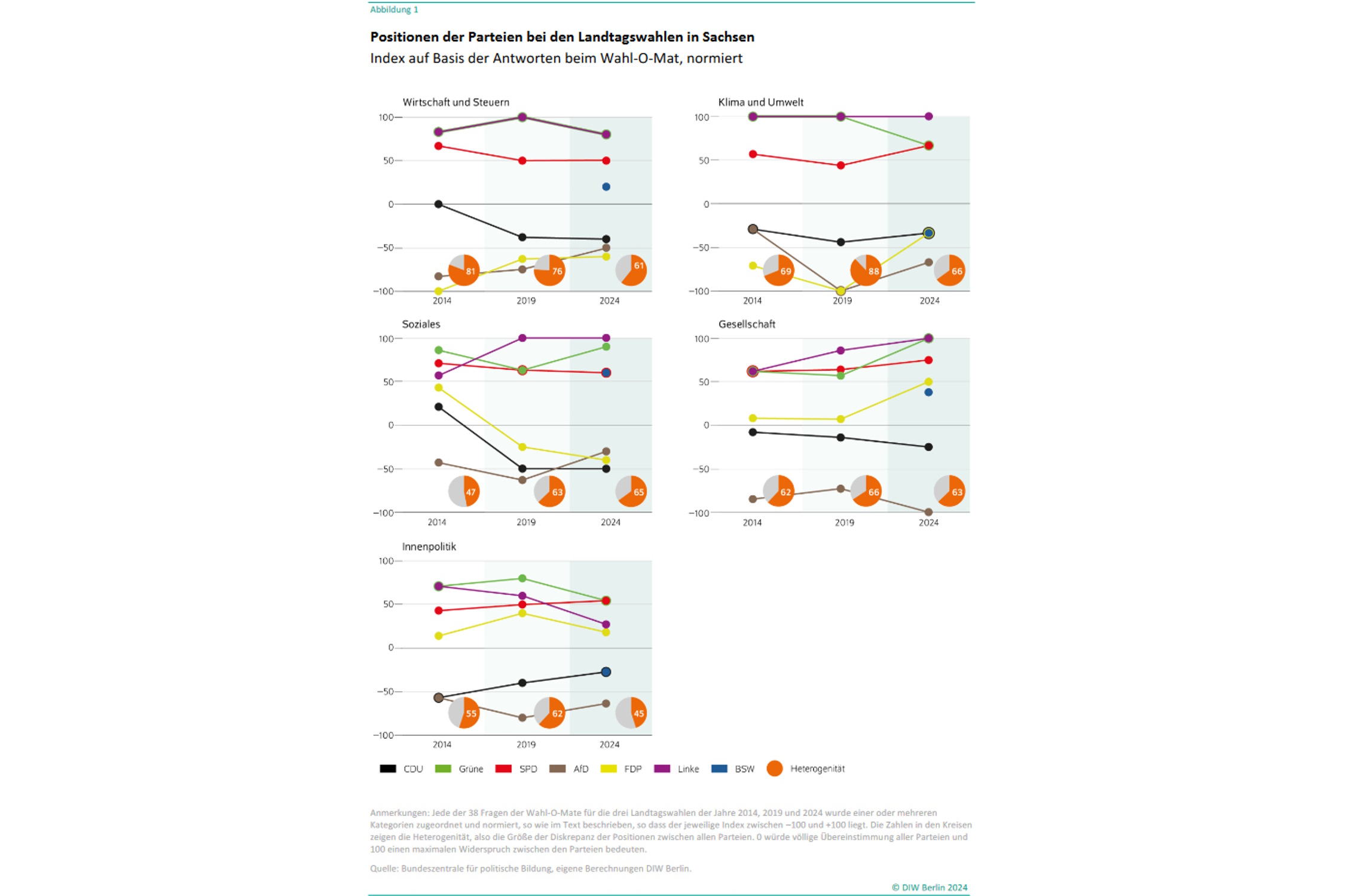 Positionen der Parteien bei den Landtagswahlen in Sachsen. Quelle: Bundeszentrale für politische Bildung, eigene Berechnungen DIW Berlin. Grafik: DIW Berlin