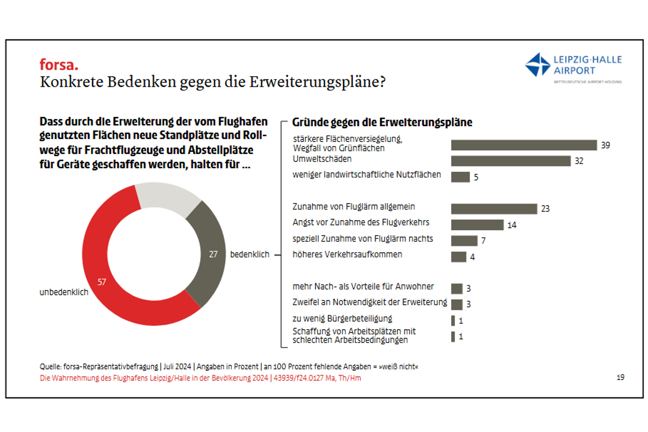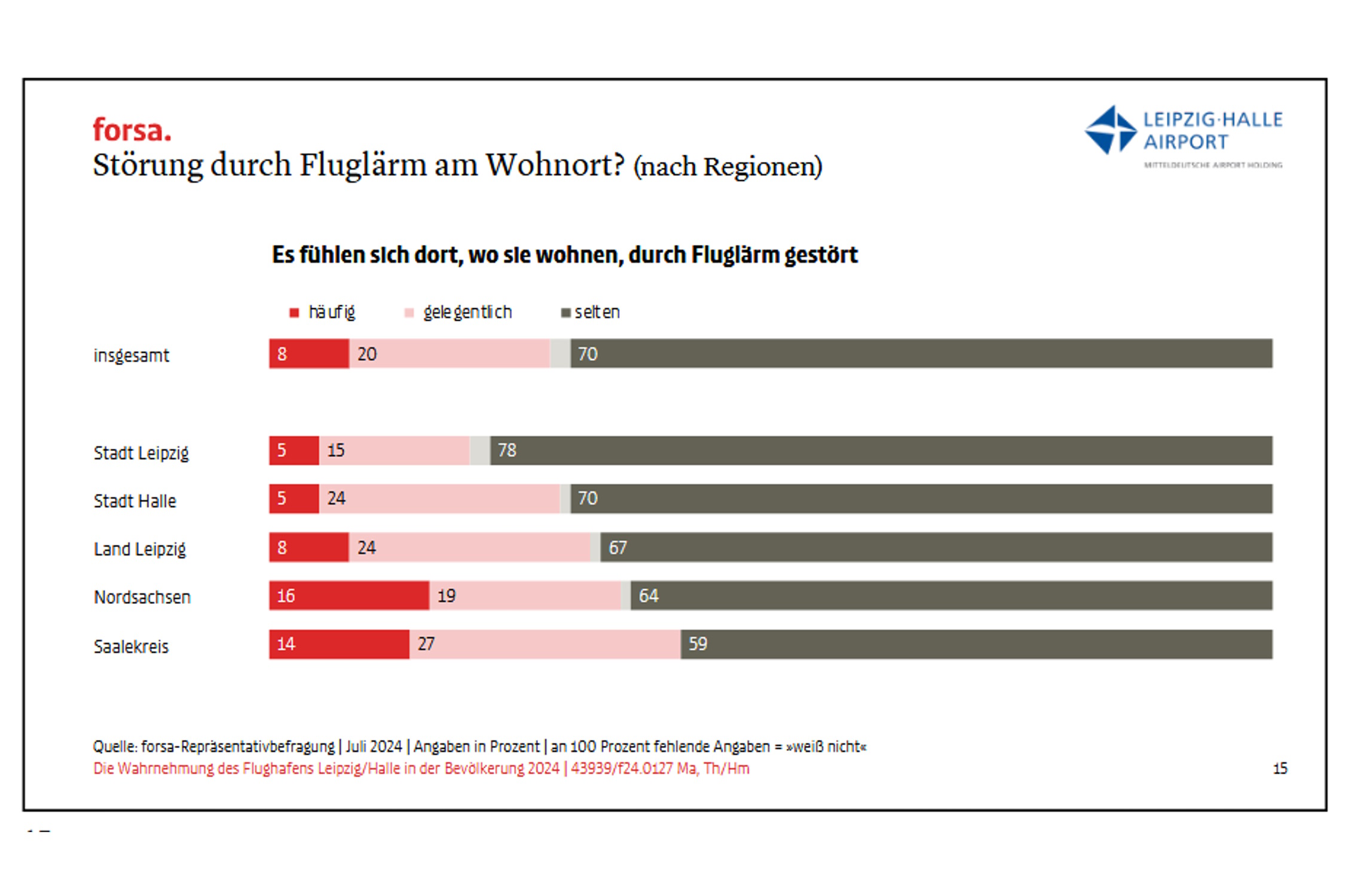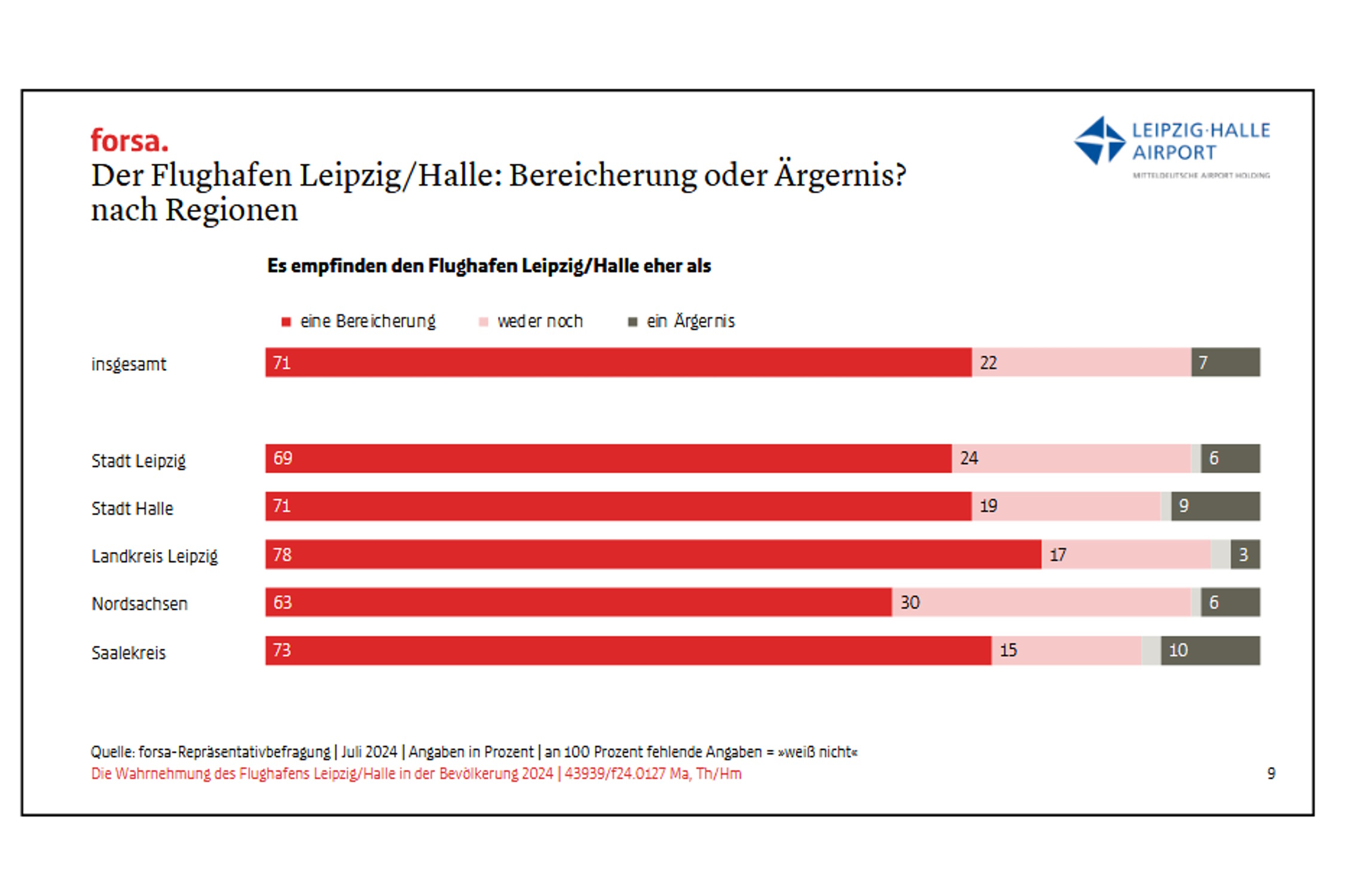 Seltsamer klingt dann schon, wenn Thorsten Thierhoff, Geschäftsführer von forsa, sagt: „Die Ergebnisse der Untersuchung von 2024 sind eindeutig: Wie schon 2022 gibt es hohe Zustimmungswerte für den Flughafen Leipzig/Halle in seiner Region. Der Airport wird von den Bürgerinnen und Bürgern nicht nur als wichtiger wirtschaftlicher Kern der Region, sondern auch als verantwortungsvoller nachbarschaftlicher Partner wahrgenommen.“