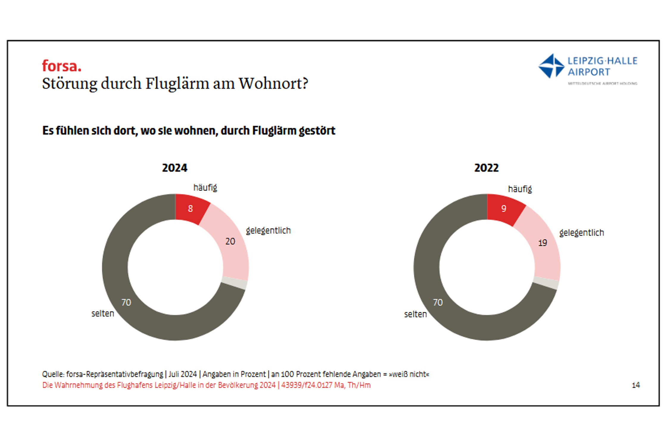 Insgesamt 71 % (2022: 71 %) der Befragten sieht im Flughafen eine Bereicherung und 84 % (2022: 82 %) der Befragten sehen in der Entwicklung des Airports zu einem Luftfrachtdrehkreuz eher positive Folgen für die Region. Die Ausbaupläne des Flughafens werden mit 57 % (2022: 58 %) von einer Mehrheit für unbedenklich gehalten. Unverändert zu 2022 liegt der Anteil derjenigen, die sich nur selten durch Fluglärm gestört fühlen bei 70 %.“