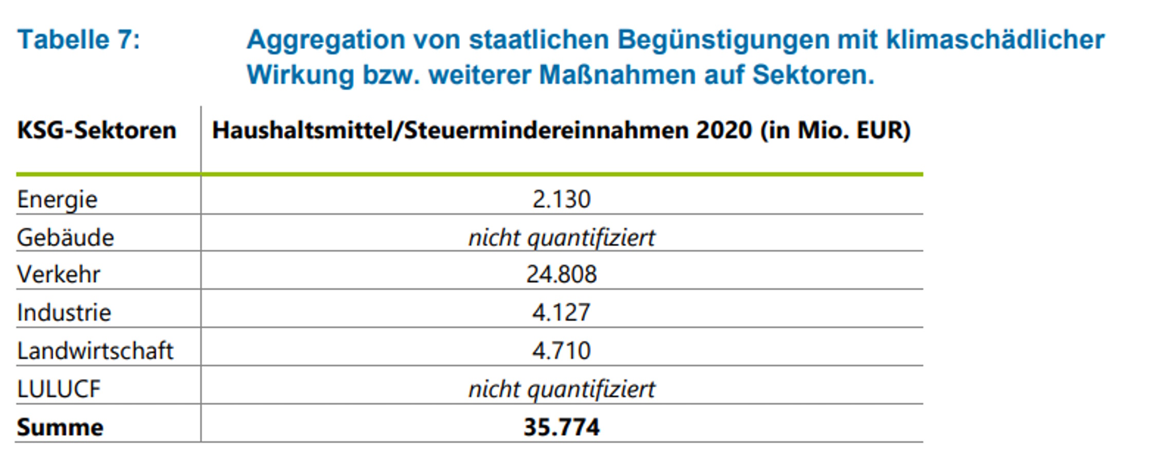 Zu den klimaschädlichen Steuervergünstigungen im Verkehr kommen dann noch die in Industrie und Landwirtschaft hinzu, die mit 4,1 bzw. 4,7 Milliarden Euro deutlich niedriger ausfallen, aber letztlich die ermittelte Summe der klimaschädlichen Subventionen auf über 35 Milliarden Euro hochtreiben und damit auch den Staatshaushalt aus dem Gleichgewicht bringen.