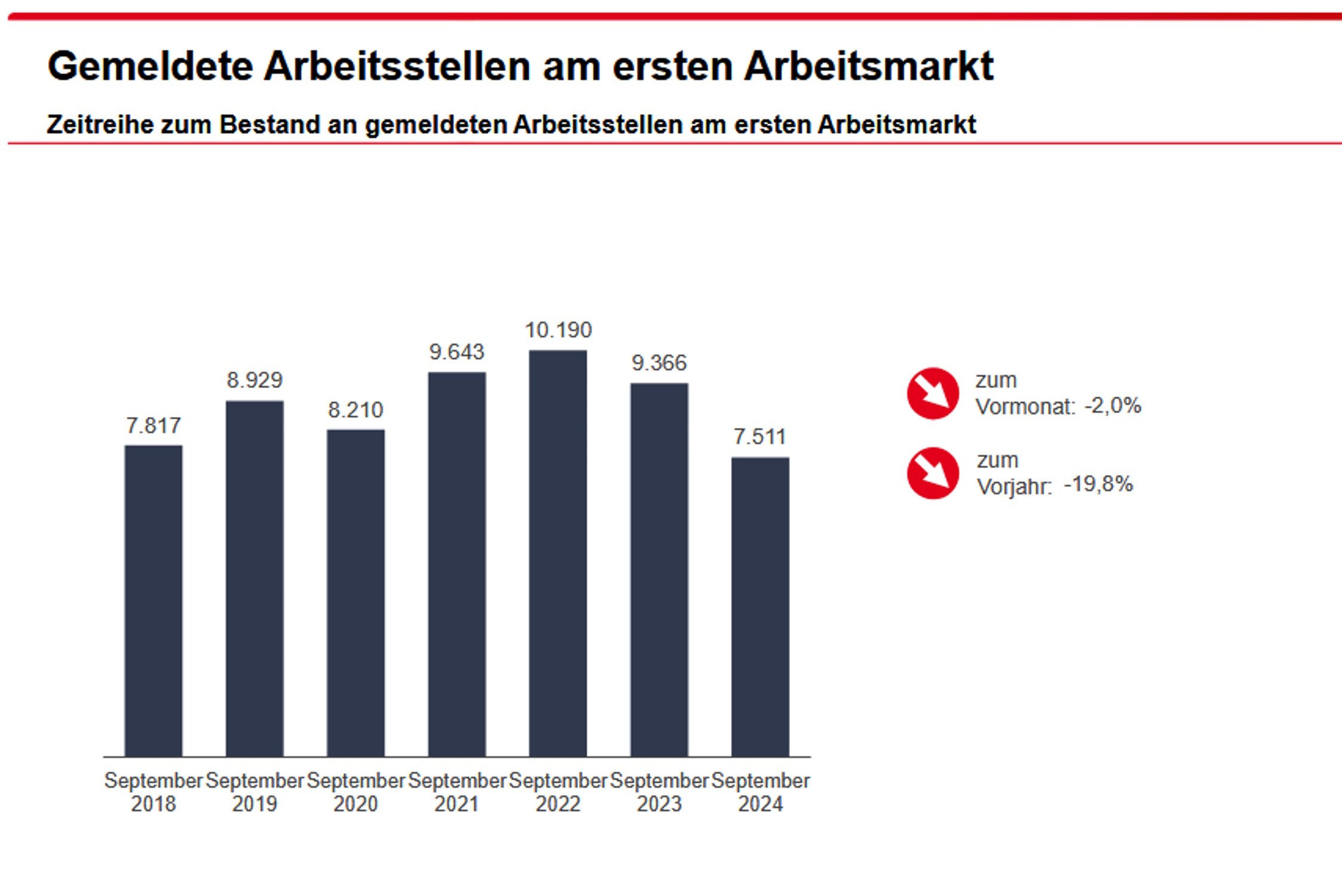 Im September meldeten sich 6.282 Personen (neu oder erneut) arbeitslos, das waren 493 mehr als vor einem Jahr. Gleichzeitig beendeten 6.220 Personen ihre Arbeitslosigkeit, 559 weniger als im September 2023.