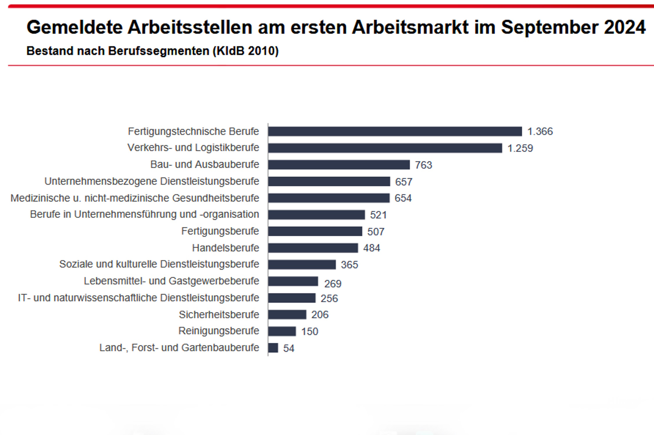 Die meisten freien Stellen sind derzeit in folgenden Wirtschaftsabschnitten zu besetzen: die Arbeitnehmerüberlassung (2.987 Stellen), in freiberuflichen, wissenschaftlichen und technischen Dienstleistungen (1.080), das Gesundheitswesen (488) und im Baugewerbe (475).
