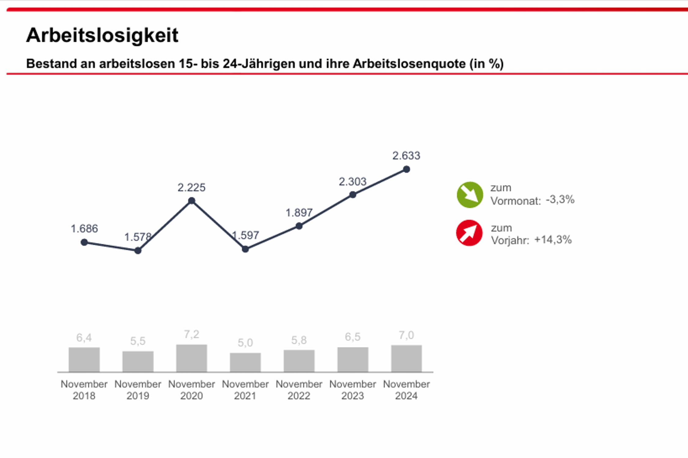 Was dann das nächste Problem nach sich zieht: Die Chancen für einen Berufseinstieg für junge Leute haben sich deutlich verschlechtert. Seit 2020 ist die Zahl der arbeitslosen 15- bis 24-jährigen kontinuierlich von knapp 1.600 auf über 2.600 gestiegen. Die Firmen halten sich bei Neueinstellungen deutlich zurück.